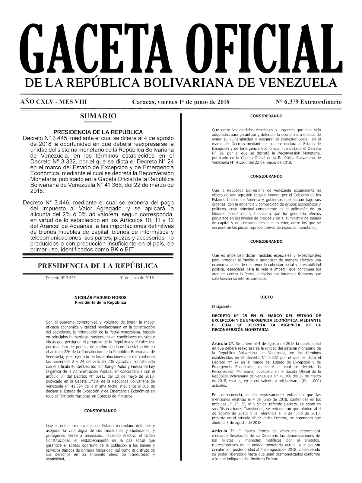 “Se difiere al 4 de agosto de 2018 la oportunidad en que deberá reexpresarse la unidad del sistema monetario de la República Bolivariana de Venezuela, en los términos establecidos en el Decreto N° 3.332 por el que se dicta el Decreto N° 24 en el marco del Estado de Excepción y de Emergencia Económica, mediante el cual se decreta la Reconversión Monetaria, publicado en la Gaceta Oficial de la República Bolivariana de Venezuela N° 41.366 del 22 de marzo de 2018, esto es, en el equivalente a mil bolívares (Bs. 1.000) actuales”, reza el texto oficial que circula este martes.